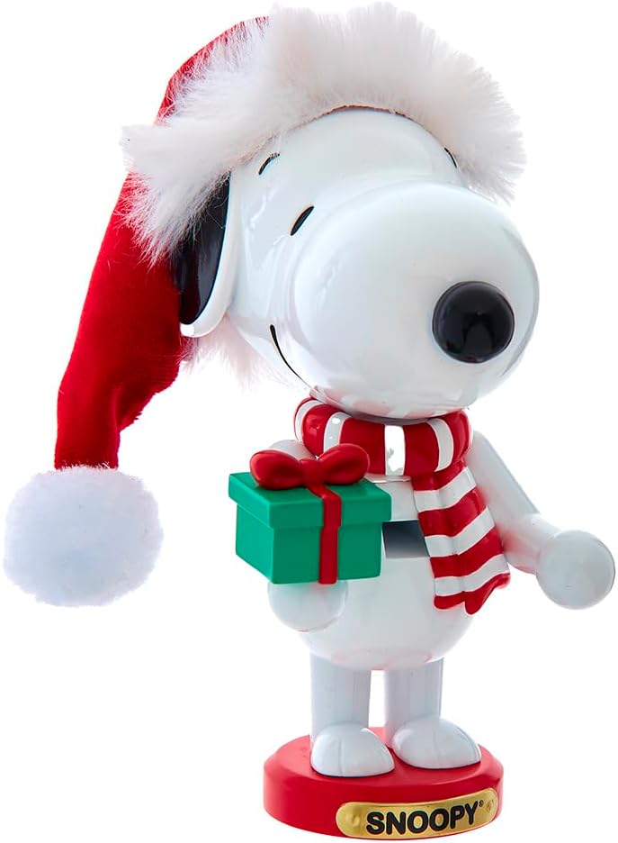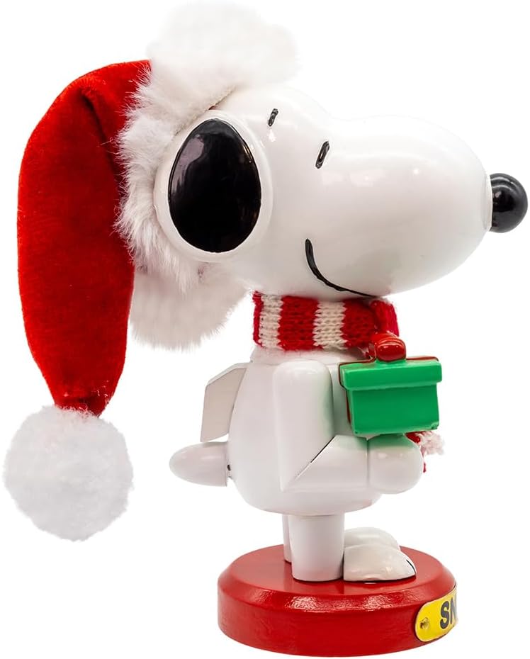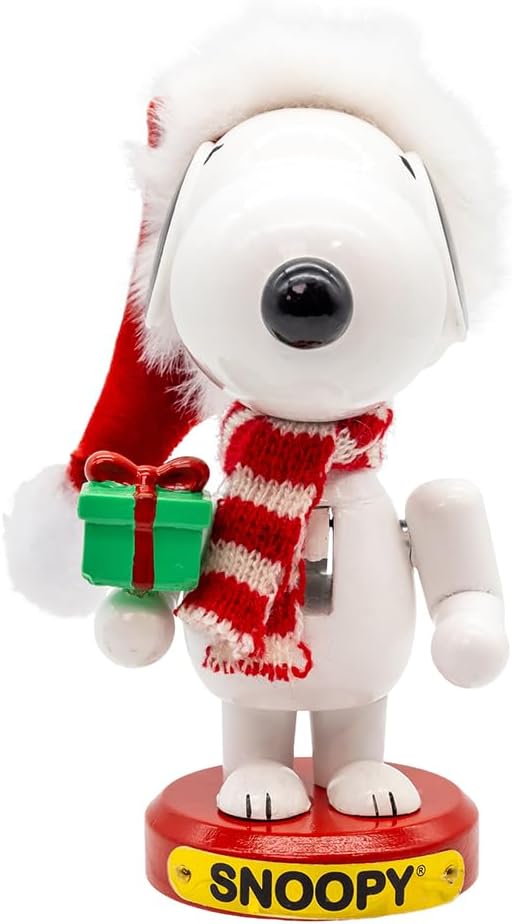 - ITEM DESCRIPTION: Add festive fun to your décor with the 5″ Peanuts Snoopy Miniature Nutcracker. Dressed in a Santa hat and scarf while holding a gift, this cheerful piece brings charm and nostalgic joy to any holiday display.